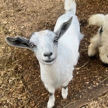 Norah came to live with us from a farm in Nevada that had recently moved to Alabama. She was one of triplets, and we have her twin sister as well. Norah is considered miniature and faints when the wind blows. She's a sweetheart and loves her animal crackers.