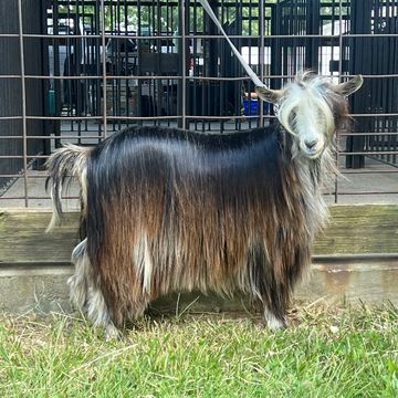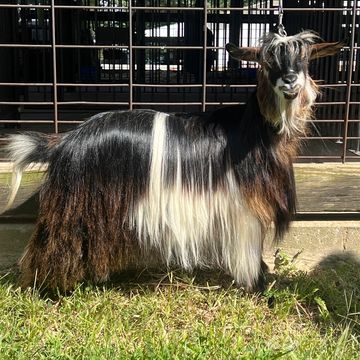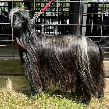 Iris is a beautiful black with white doe and has a gorgeous coat. When we decided to get her, Greg made an overnight run to Missouri by himself. Iris had a beautiful buckling in 2024 that found a wonderful home not too far from us. We're excited for future breedings.
